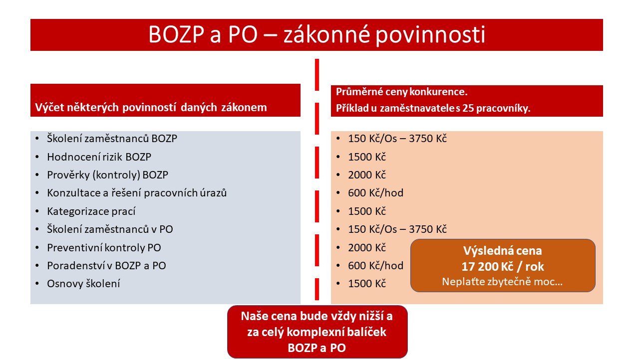 Na ceně opravdu záleží, proto vám garantujeme nejnižší cenu na trhu. Služby poskytujeme jak na základě smlouvy, tak na základě jednorázové objednávky. My vám nebude účtovat za jednotlivé položky, ale připravíme pro vás komplexní cenu za celý systém BOZP a PO. Dokážeme vaše náklady na BOZP a PO snížit až o 50 % a zaručit vám 100 % profesionální služby a 100 % kvalitu. Pomůžeme i s oblastí ochrany ŽP. Dokážeme zabezpečit firemní certifikaci dle norem ČSN ISO 9001, 14001, 41001, 45001. Provedeme interní audity dle daných norem.